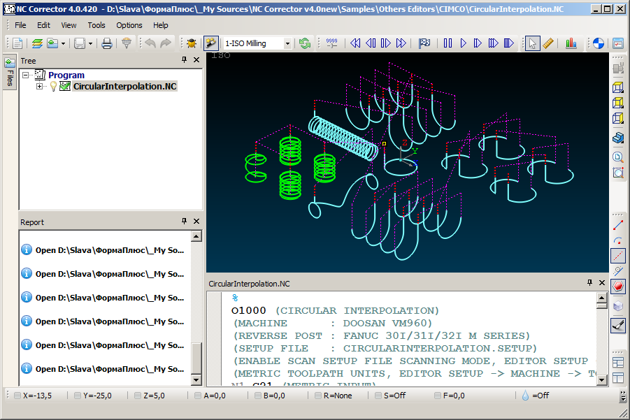 Supports CNC Milling, Lathe, WireEDM machines. Supports basic G and M functions, drilling cycles, subroutines. Automatically detects 5 types of arcs. Export to DXF, APT format. Displays information about the program in the tree. (Machine time, trajectory length, MAX MIN trajectory points, number of segments, arcs, etc.) Hint on G, M codes when hovering the mouse. Shows trajectory points, arc centers, technological stops. Displays the equidistant correction. Frame-by-frame navigation with current program parameters displayed in the status bar. Information about an element when you click on it in the graphics window. Powerful measurement engine and much more.